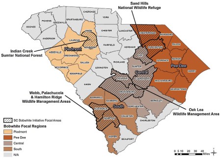 The heart of the S.C Bobwhite Initiative is based around four “Focal Regions” encompassing smaller “Focal Areas,” locations that experts believe have the most potential for growing the greatest number of bobwhites. To identify the regions and areas within those regions, biologists crunched a lot of data about how land is used in different parts of South Carolina and the types of cover and vegetation that dominate the landscapes across the state, and they determined that these areas were the sweet spots for growing quail. These areas aren’t the only areas in the state with bobwhites, but they do present the best opportunities to increase populations quickly and with the most bang for the buck.