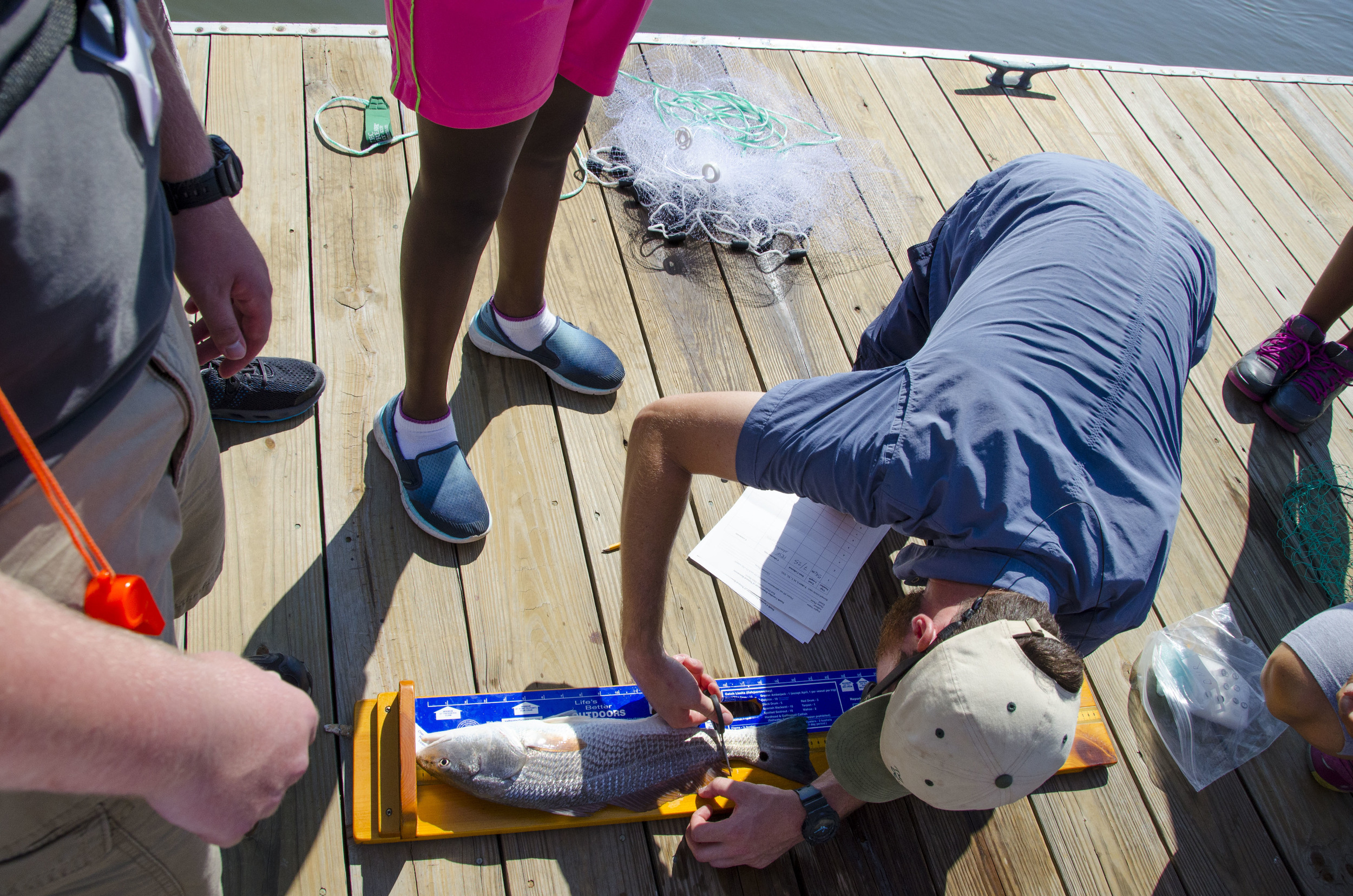 Down on the floating dock, a camper landed a nice-sized red drum, and using a DNA collection kit provided by the DNR’s Waddell Mariculture Center, Keherer demonstrated to the group how to measure the fish and then take a small fin clipping before returning it to the water. Red drum larvae produced from wild fish captured by DNR biologists are stocked into outdoor nursery ponds at the nearby Waddell Center in Bluffton, where they’re raised to a size of 1-2 inches before being harvested and stocked in South Carolina’s coastal estuaries, including Port Royal Sound. The genetic information contained in the clip of fin from a caught-and-released red drum gives DNR scientists very valuable information about how the stocking program is working, and about the overall health of the fishery. Since 2003, DNR biologists have worked with charter boat captains and other recreational anglers to collect fin clips from red drum caught in Port Royal Sound and elsewhere. These young campers are learning firsthand and early on about the importance of anglers working together with the DNR to help conserve and protect the health of fish populations like the red drum, as well as the important role that the estuaries and marshes surrounding Port Royal Sound play in nurturing red drum and many other species.