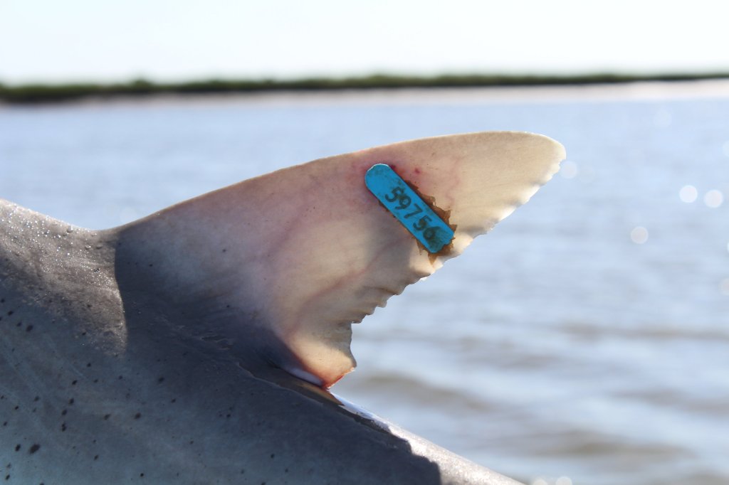 A familliar fin: this bonnethead shark was recaptured years after SCDNR biologists first caught and tagged it. Recaptures provide invaluable information about how sharks are doing in South Carolina. (Photo: E. Weeks/SCDNR)