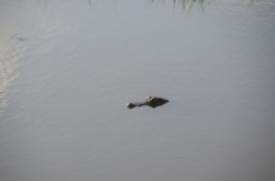 I look around at the acres and acres of marsh where we are sitting – several miles from the equipment shed at SCR Headquarters and help, even as the crow flies (only we ain’t crows). “What do you do if that happens,” I ask? Sim shows me a sturdy steel anchor strapped to the steel cage on the roof of the cab and then points down between us to the big winch at the front of the machine. It’s a strategy that requires the operator to get down in the knee-to-waist-high water of the impoundment to stick the anchor in the mud bottom, slog back to the machine and hope the winch can pull you up to more solid footing. Lather, rinse and repeat as necessary. I think about that for a minute – slogging across fifty yards of prime gator habitat to bury that anchor in the mud – watching while a hawk circles on thermals above a faraway tree line. All of a sudden it feels kind of lonely. As if reading my mind, Sim kind of laughs. “There’s a lot of small gators out here,” he says.