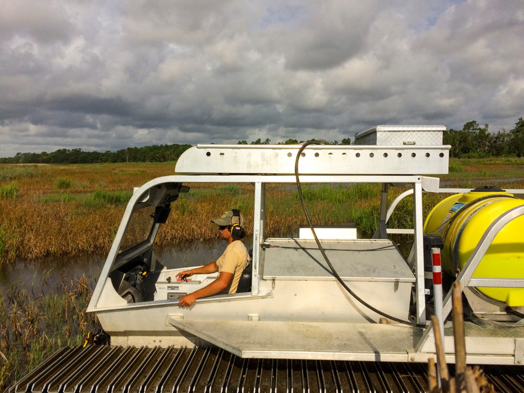 So how’s that for a first job out of college? Pretty great if you grew up hunting and fishing in the Lowcountry of South Carolina and working in this environment is all you ever wanted to do since you were a kid, says Sim, who first came to work at SCR as a student intern while studying wildlife management at Horry –Georgetown Technical College. He graduated in the summer of 2015, and when a technician’s job came open at SCR, he jumped at the chance. I do the math in my head: this means he’s been operating the Marshmaster probably less than a year, yet it’s obvious he’s both skilled and comfortable with the machine. Coming out here, when we dropped off the edge of the dike and into the main feeder canal with a great splash and began crawling up the other side on the way into the impoundment, it took several tries for the machine’s massive floating treads to grab hold and pull us up the other side. Each time we’d tip sideways a little, Sim would back off a bit and try a new approach until finally the treads caught and we crawled up and over. I got the feeling he was taking it easy on me –– maybe understanding the fear a newcomer experiences when the machine dips hard one way or the other and all of a sudden that distant tree line visible through the muddy windshield is on a thirty-degree slant. I ask him about how he got so good, so quickly, at this seemingly endless task of maneuvering a howling diesel contraption back and forth across acres upon acres of salt marsh at literally the ends of the earth? The answer is hours spent in the driver’s seat, and a real passion for the work of managing Santee Coastal Reserve.