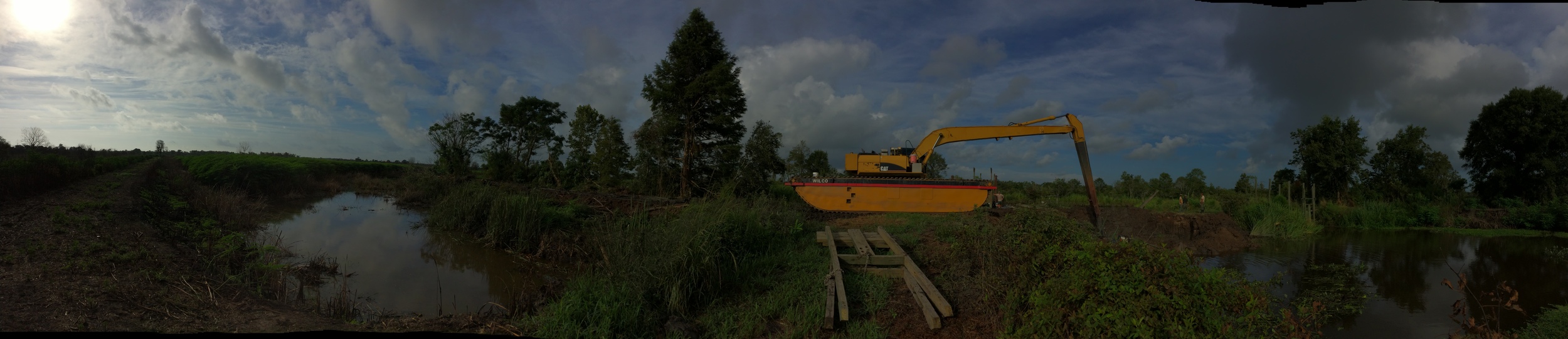 Imagine an ATV pumped up on more steroids than the Russian Olympic team; a massive diesel engine driving a pair of tank-like tracks above which sits a steel platform with just room enough for a cab for the operator and some cargo space. The tracks themselves spin around a set of pontoons, which gives the beast enough buoyancy to cross creeks and streams, with the turning tracks providing enough forward propulsion. It’s slow….and loud – both operator and passenger wear ear protection to guard against the diesel’s incessant roar at anything other than a dead idle – but the thing can go just about anywhere, and where it’s going right now is down and across a dike and ….Splash!… directly into the main canal feeding water to the impoundments of The Cape.