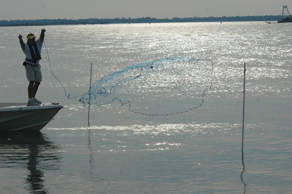 13. Start using your cast net back at the beginning of your line of marked bait poles after you have placed all of your bait balls. Cast a few times around each pole and then drift/steer towards the next one.