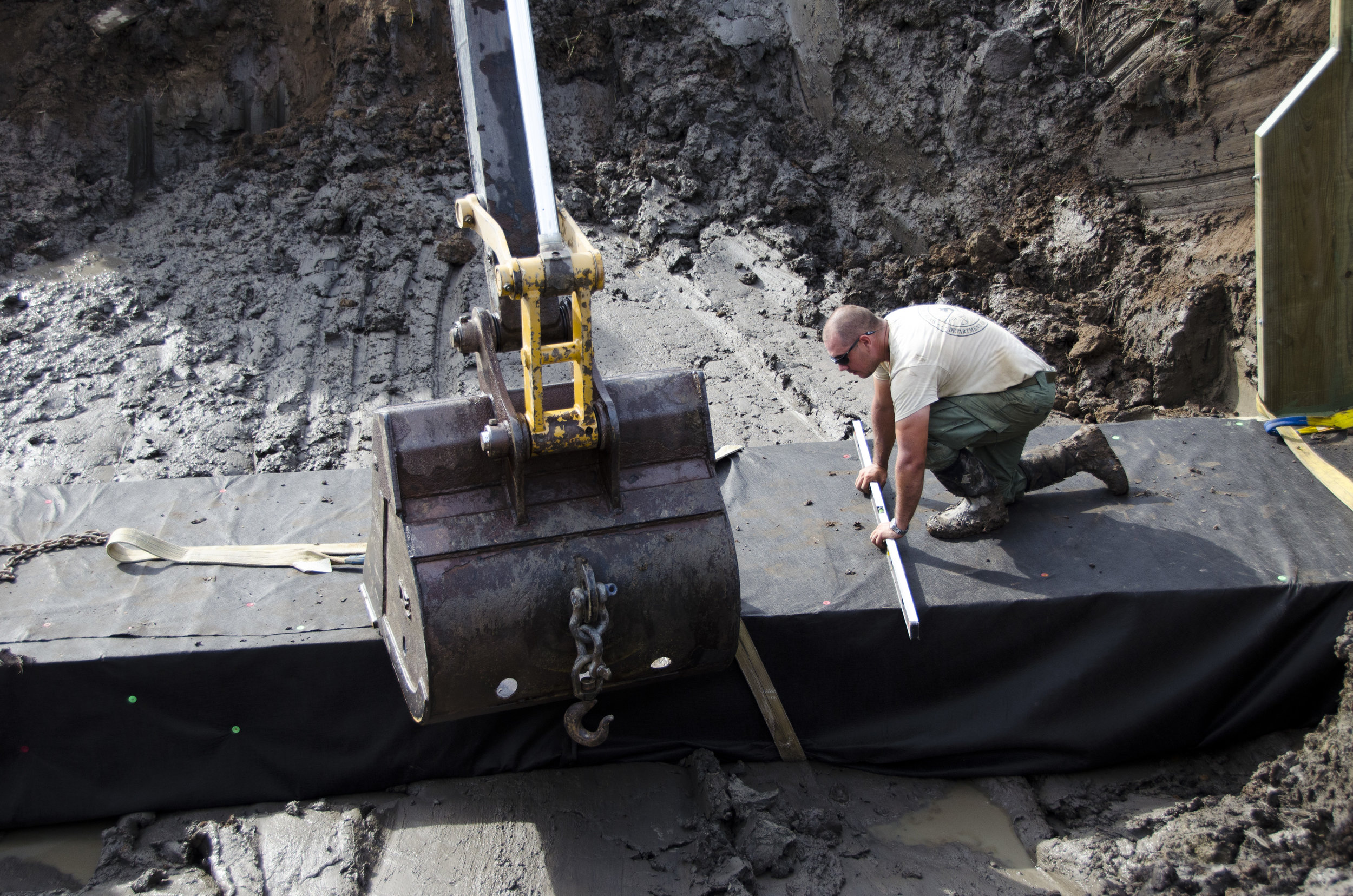 Between scooping with the Amphib’s bucket and rigging up a generator-driven pump, by 8 o’clock the crew has the water cleared from the hole, and Tucker begins re-shaping it to the needed size and depth to accept the box with Deavers directing him from below and Carnaggio taking constant measurements using surveying equipment.