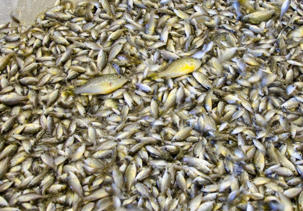 The steps lead down to a catch-basin at the base of the pond dam. The basin is called a “kettle,” Hite explains, and the particular style of kettle at some of the newer ponds at CCFC is a “Kansas kettle,” an improved design that makes harvesting the fish somewhat. easier. Rose, Boyleston and Mitch Manis use specially-designed flaps and a seine net to corral the swiftly darting fingerlings in the “kettle” and transfer them to the buckets, while the rest of the crews carries them up to a waiting truck, fire-brigade-style. Then it’s on to the “fish house,” where the fingerlings are transferred from mobile truck tanks into stationary tanks refreshed by a constant flow of fresh water from the deep wells that feed the hatchery. The fish house itself is kind of an amazing place; the spare parts, pipe, valves and various tools in the main room let you know right away that the folks who work here – while they are indeed scientists in every sense of the word – aren’t nerdy guys and gals in pristine white lab coats. This is an endeavor that also requires practical skills such as carpentry, plumbing and electrical work to make it all go.