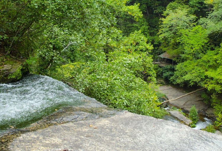 Wooden stair steps help hikers navigate the steepest parts of the trail. Overhead, hardwood trees and a few pines create a shady canopy. The creek tumbles down the gorge – mainly on your left – as the switchbacks wind you up and up the steep hillside to the summit. The marked trail ends just above the point where the top of the falls can be seen, but trout anglers and other adventurous types have created paths alongside the creek that go further up the mountain.