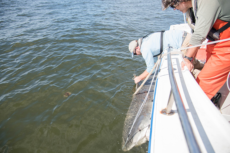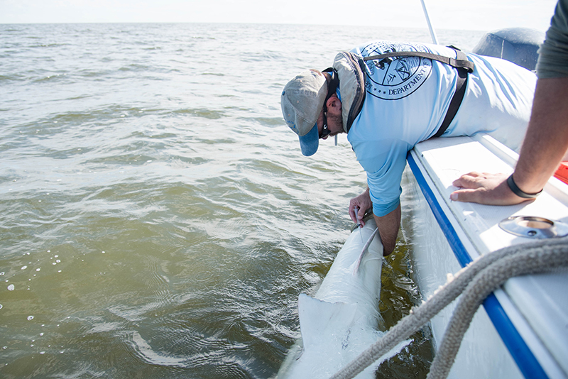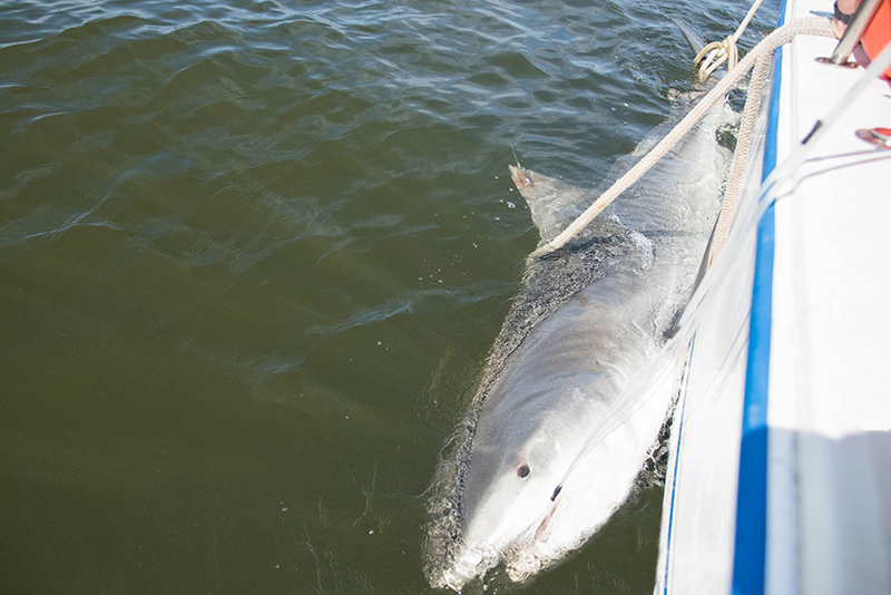 It was an early morning at work, earlier than most. I was sitting in my car at the Bennetts Point boat slip before sunrise waiting to see the familiar SCDNR logo pull in beside me, signaling the beginning of my work day. I knew an exciting day on the water was ahead, as I was to take photos and video of our agency biologists attaching a satellite tag to a fin. My only frame of reference came from my annual binging of Shark Week on Discovery Channel. Jarring me from my thoughts, I heard the truck pull in, saw the four-person crew start loading gear from the bed of the truck onto the bow of the boat, took a deep breath, and opened my door.