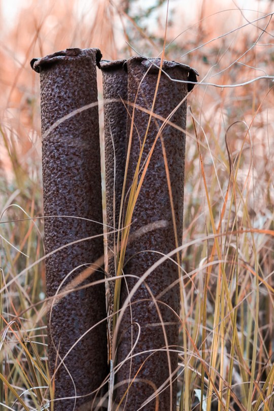 Edwards also took note of interesting remnants from the past. She was drawn to photograph the rusted pipes overtaken by native vegetation in the marsh and wondered what may have caused the “blown-out” ends.