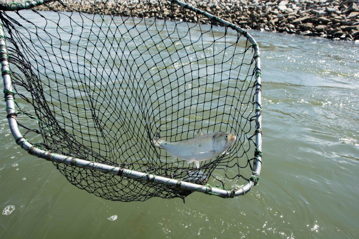 Strip spawning! Back to the drifting gill net! We’d caught some fish that day on the river. We had both roes (females) and bucks (males), and there was a wave of excitement on the boat. We quickly separated the roes from the bucks and put the net out of the way. We gently squeezed some of the females. Nothing. No eggs. What were we doing wrong? Were we too early? We squeezed again and a small amount of white eggs poured into the pan. Next fish. She was ready; a steady stream of those golden jelly balls poured into the pan. Jack pot! We quickly learned through the process of strip spawning American shad that it is not an exact science because we were in their domain. After fertilizing the eggs, bagging them and transporting them back to the hatchery, it was around one in the morning. I had been up since 4:30 a.m. I was sleepy, tired, excited and anxious all at the same time, hoping our experiment would work. We would have to wait until we returned to the hatchery to know for sure.