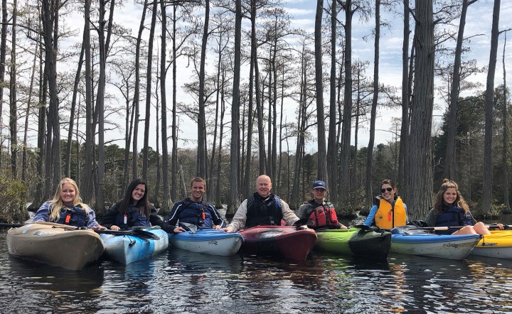 The kayak excursion led by Global Eco Adventures Adventurer Club connected high school students with the outdoors while encouraging discussion about the environment. Above: From left to right, Camryn Price, Ansley Stone, Will Galloway, Tom Mullikin, Thomas Mullikin Jr, Kellan Young and Carly Clark.
