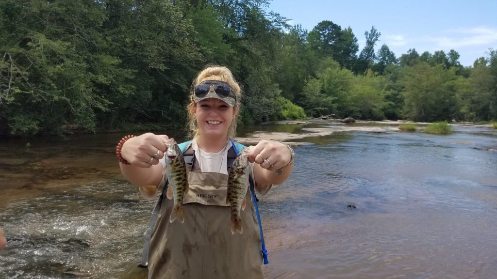 Not only have I gained knowledge in identifying fish species, I also was educated about Bartram’s bass, which is one of South Carolina’s native bass species. I had seen largemouth bass, smallmouth bass, Alabama bass, and redeye bass, but never a Bartram’s bass. During the Bartram’s bass survey, we were able to collect several bass and take fin clippings to send to a genetic lab for further research. They have a unique vertical striped pattern along their abdomen that is very different from other bass in the state. The Bartram’s bass population has declined due to competition with other bass species and has even began to hybridize with Alabama bass.