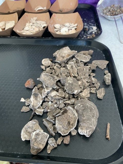Between meetings, I continue cleaning. These bags include lots of oyster shell, along with nails, pottery, glass, and the occasional clay pipe. I also find a lot of tabby mortar, which composes Fort Frederick’s walls.