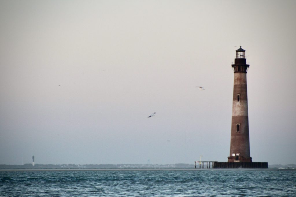 My stride was relatively unburdened by the weight of my rod, tackle bag slung over one shoulder, and bucket with a half-functioning cast net and navy blue Yeti cup. In short order I passed the group. As the road turned from asphalt to the thick sand of a rising dune, the path narrowed. A group of two women and two men with a little boy of about four walked methodically ahead. I slowed my step to follow them to the dune’s crest. Like a curtain drawn back to bathe a stage in spotlight, the white and rust-colored Morris Island Lighthouse seemed to slowly ascend from the sand, the wind-tossed waters of the Atlantic appearing below.