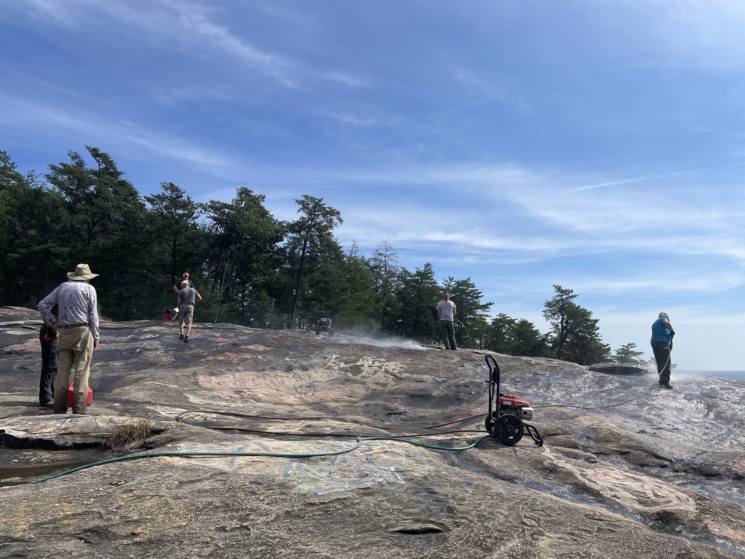 On day two of the cleanup, the River Falls Fire Department brought its pumper truck with 2,200 gallons of water to assist with pressure washing. (Cedar Mountain Fire Department agreed to be on standby to provide additional water, as needed.) Volunteers were on the rock by 8:30 a.m. and ran four pressure washers simultaneously for five hours. Eight volunteers worked in shifts throughout the day. Volunteers quickly discovered pressure washing is exhausting and not-immediately-rewarding work.