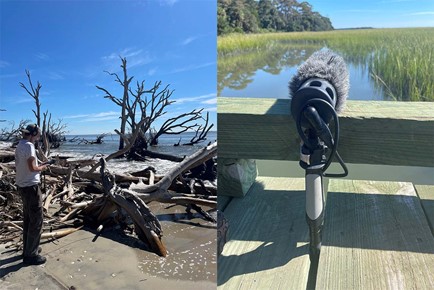I decided to try applying these technologies to our heritage at risk sites in South Carolina. In order to recreate the environment, I needed a lot of reference material. During our time at Pockoy Island, I took hundreds of photos for reference. My supervisor, Meg Gaillard, also showed me how to use a directional shotgun condenser microphone and hydrophone to collect natural soundscapes from all around Botany Bay – both on land and in the water.