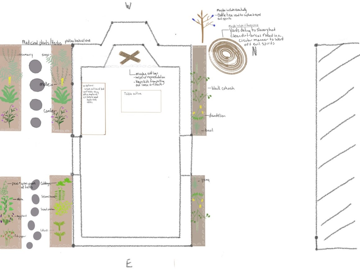 The final parts of this project consisted of research on the plants that would be planted by an enslaved individual within a subsistence garden. I began this research by reading The Cooking Gene by Micheal W. Twitty, along with many other articles. Eventually, I compiled a long list of plants which I sorted by their use either edible or medicinal. I then drew up a detailed garden plan of where and what plants would be best to include.