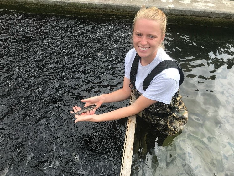 “At the hatchery, I have been learning about the aspects of trout culture on rainbow, brown and brook trout. I monitor water quality daily, complete basic husbandry tasks, load stocking trucks for stream stockings in public waters of South Carolina, disease assessment, utilize various means of treatment for diseases and parasites, clean raceways, data entry, and move and inventory fish among raceways.” – Hailey Binkley