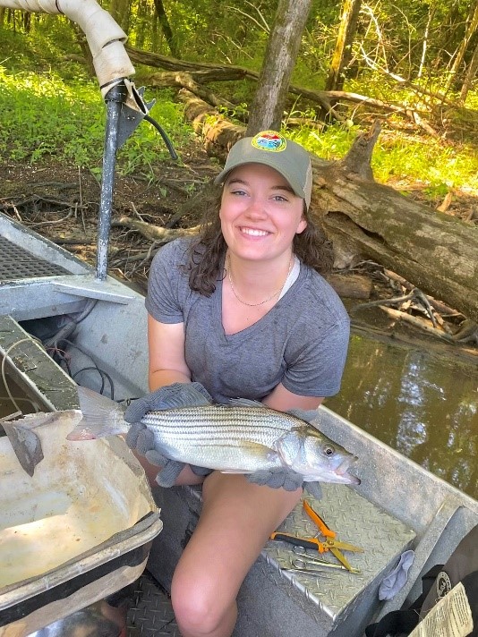 Fisheries Region 2 Intern Bonnie Tanner holding a striped bass before taking a fin clip and spines for a genetics and age study.