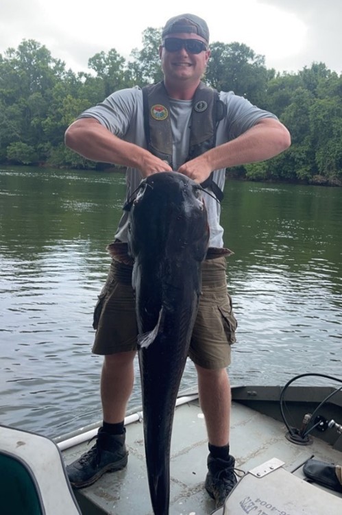 Fisheries Management Intern Graham McLaughlin holding a flathead catfish (Pylodictis olivaris) that was caught during an electrofishing survey on the Catawba River in York County, SC.
