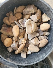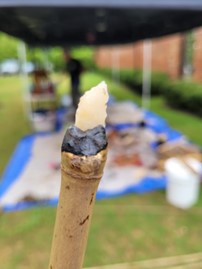 To even create a bead, we first had to choose stones, and diligently break them apart until a small point was created. After that, a piece of rivercane was chosen and cut using a flint flake knife. Pitch was created by melting pine tar in an oyster shell over a fire, and our canes were placed in the flames to straighten them out. The points were then connected to the river cane using the pitch.