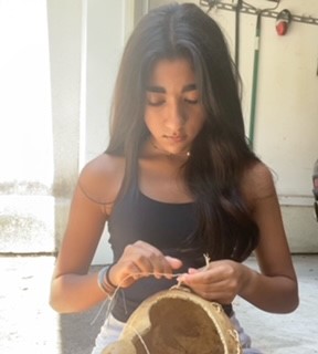 After the initial creation of the containers, we were instructed to add decorations or additional functional aspects to the gourds. While the initial demonstration had seemed fairly straightforward, I found myself branching off more from the original examples as I experimented with different techniques. While I didn’t have the artistry or expertise required to make the charcoal designs on the outside of the gourd as precise as I would have loved them to be, it was interesting and fun layering different designs on top of one another and attempting to make the designs bolder and more symmetric using a bone awl, charcoal and water. I added a handle using cordage made from raffia, and weaved the cordage through holes in the gourd to create designs. By the time I was finished, I had a product I had spent a lot of time on and was surprisingly proud of- the same way Native Americans in South Carolina must have felt when they created these containers that they would later use for food, water, and other items.