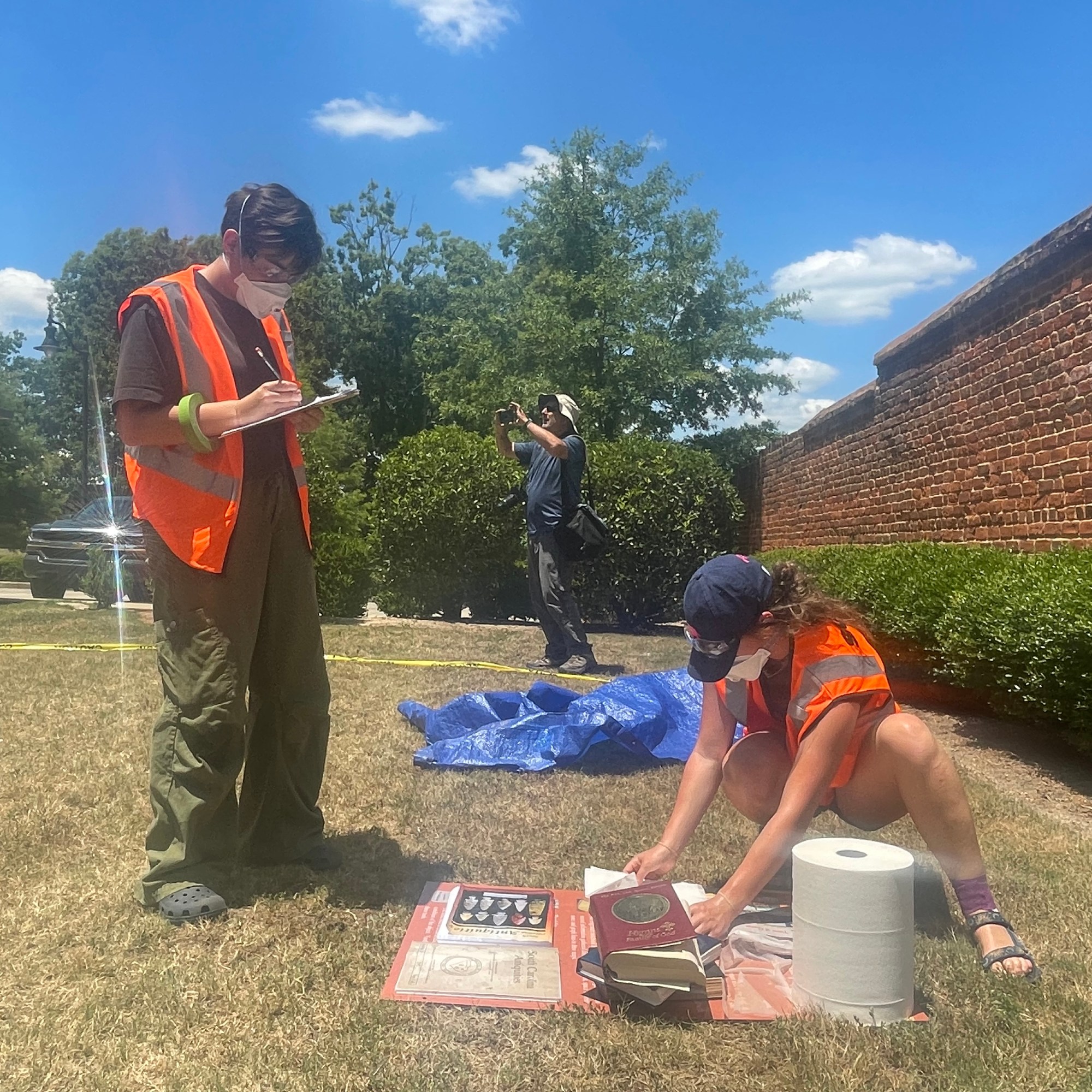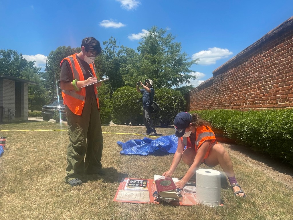 Note: Photos that can be used for this article include those taken during the interns’ Disaster Recovery Workshop at SCDNR’s Parker Annex Archaeology Center. During this workshop, interns learned how to recover cultural materials (e.g., artifacts, documents, photographs) damaged during a hurricane scenario. Similar recovery and documentation methods are used by cultural resource professionals documenting damage to cultural resources in times of war.