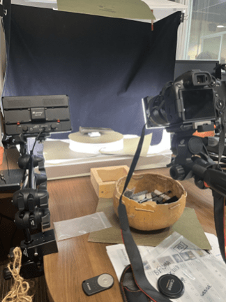 However, the jugs were not without their difficulties. For one, most of the jugs were made out of reflective materials. Ordinary light shone onto the jugs would inevitably turn up in the final model, creating an inaccurate representation of the jugs. To solve this issue, Charles taught me to utilize a polarized lighting system. Polarized light is light that is passed through a filter, changing how it vibrates. Then, using a specific lens on our cameras, we can block out the reflected polarized light. In this way, while the jug is lit up, much of the unwanted reflections are eliminated, leading to more accurate models.