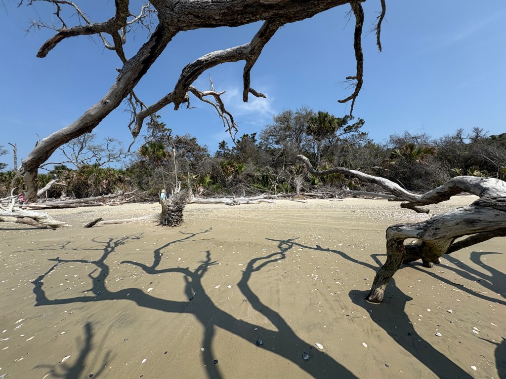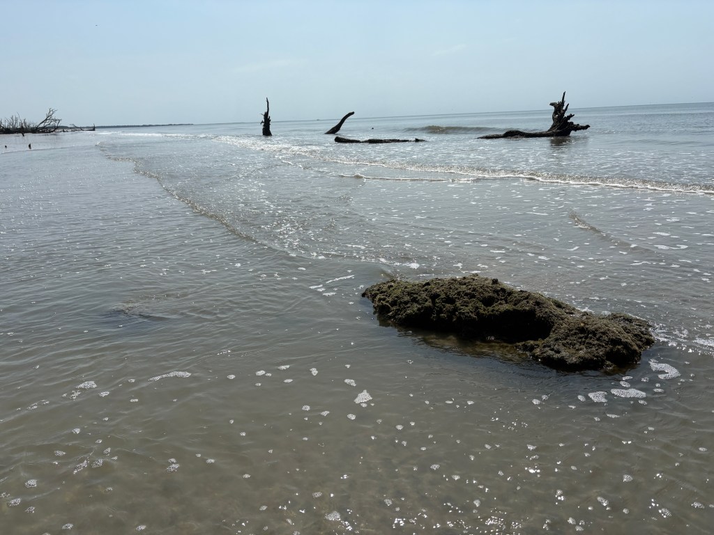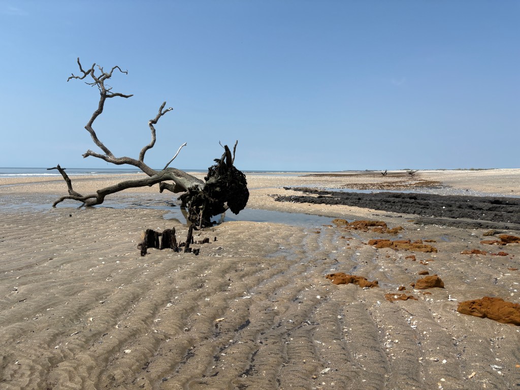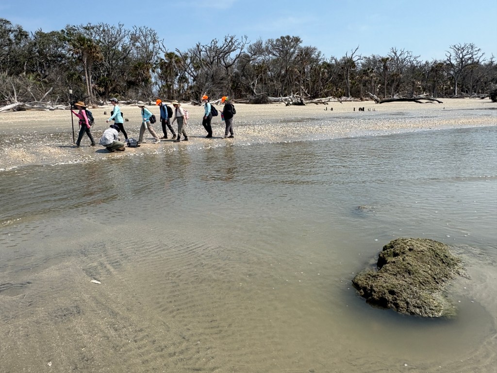Storms and high tides can undercut the shoreline, which along with saltwater intrusion, contributes to destabilizing the soil matrix and root systems. These effects cause the trees to fall and erode the shoreline, converting the maritime forest into a beach environment. While on the island, we saw the few remains of the first shell ring, which had already been eroded and destroyed by the water. We could see a small portion of the original site at low tide, but it was clear that the rest of the shell ring was gone, unable to be studied in its original context.